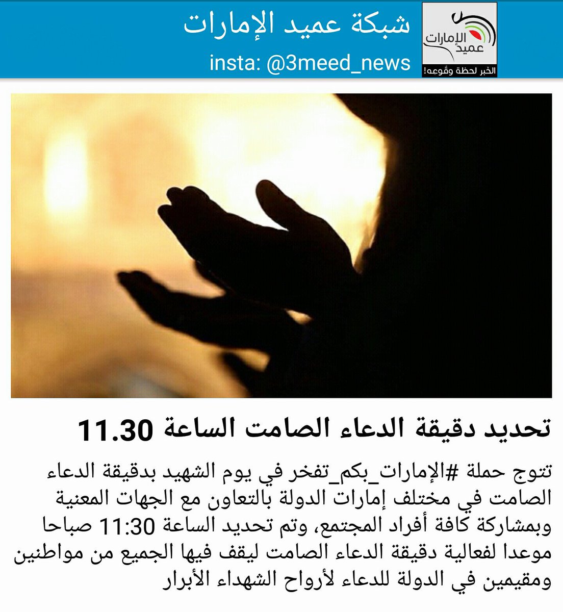 شبكة عميد الإمارات Auf Twitter تتوج حملة الإمارات بكم تفخر في يوم الشهيد بدقيقة الدعاء الصامت في مختلف إمارات الدولة بالتعاون مع الجهات المعنية وبمشاركة كافة أفراد Https T Co Odhdf9bic5