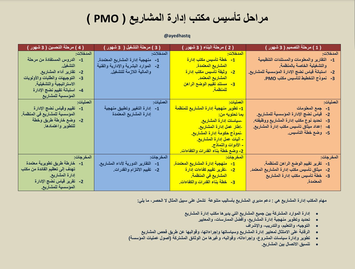 عايض بن سالم القحطاني V Twitter مراحل تأسيس مكتب إدارة المشاريع Pmo في المجتمع الوظيفي وهو لا ينفذ المشاريع ولكن يخطط ويراقب ويقيم ادارات المشاريع وتنفيذها في المنشاءه بالاضافه الى التدريب